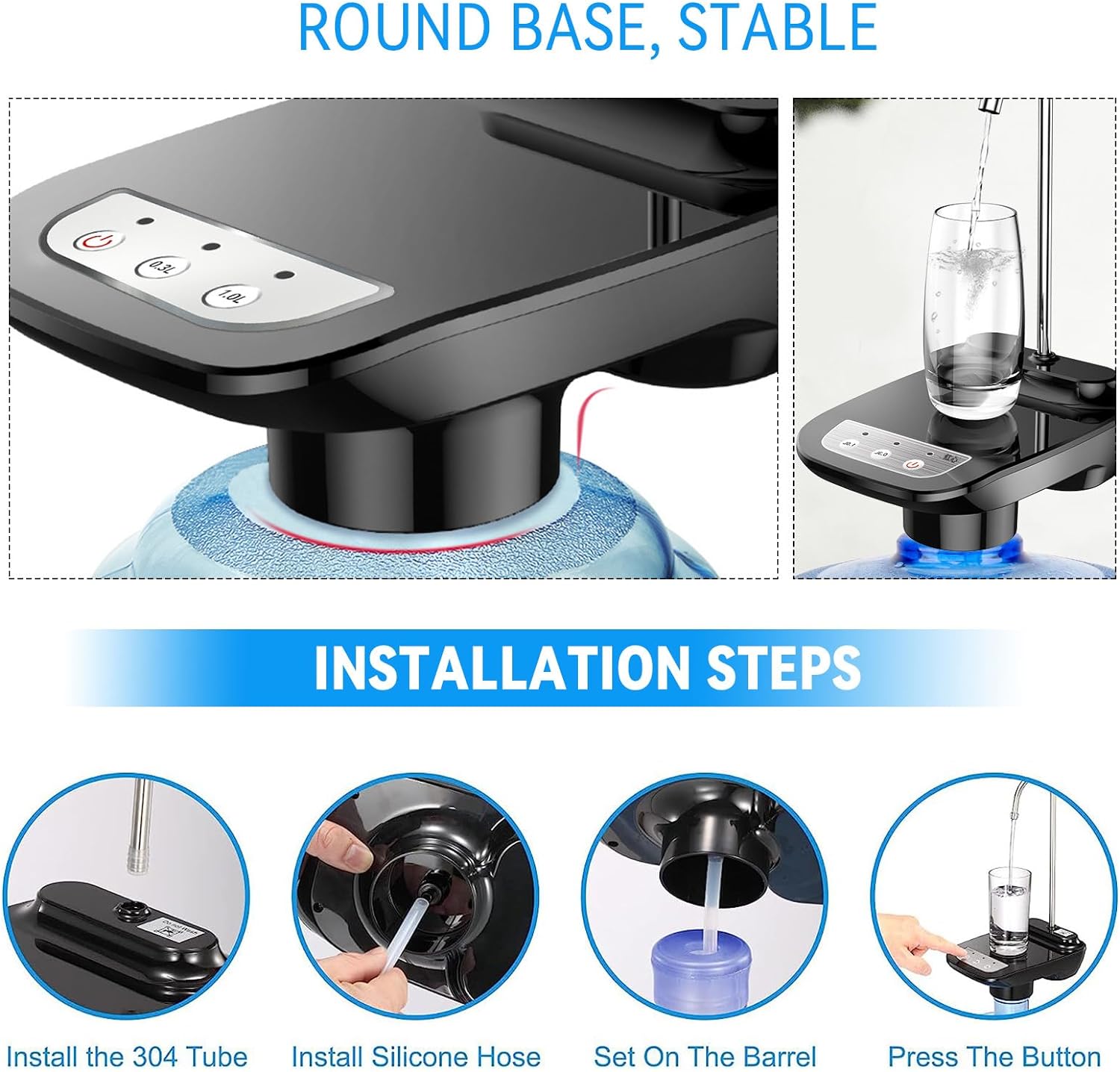 بتركب بسهولة على جالونات من 3.8 لتر لحد 18.9 لتر (يعني من 3 لـ5 جالون)، وخصوصًا اللي بفتحة 52mm إلى 55mm – سواء مياه معدنية أو عادية.