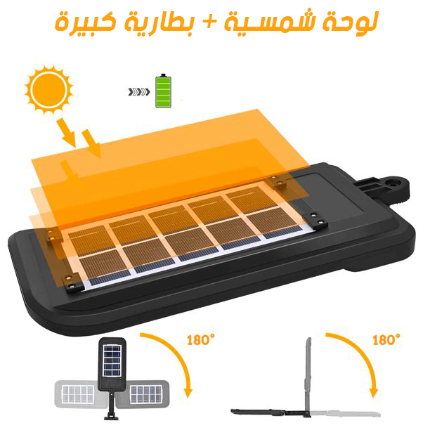 • يشحن عن طريق الشمس فقط و لمدة 6 الى 8 ساعات وبيفضل شغال حتي أسبوع .